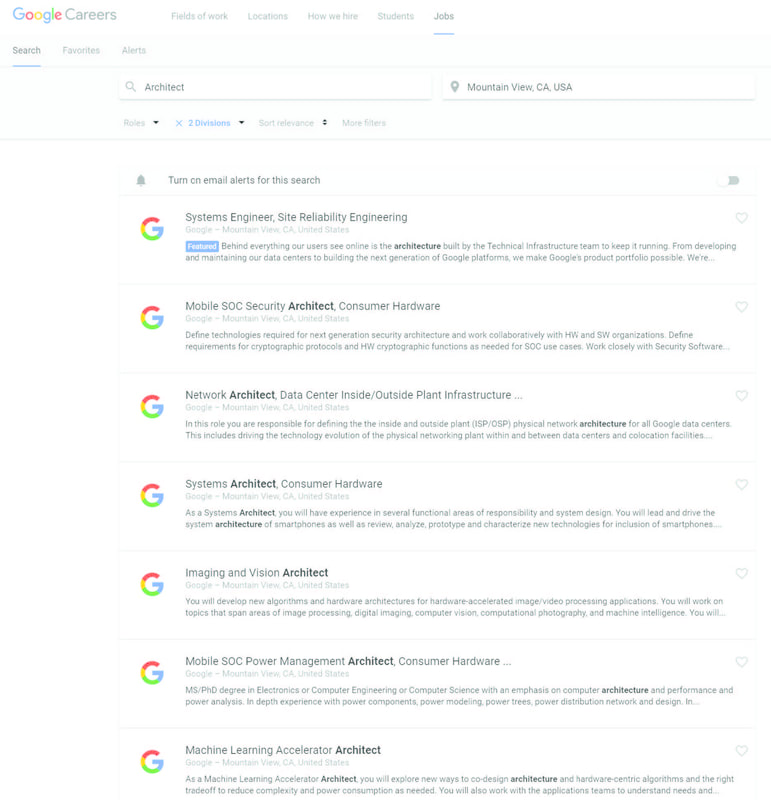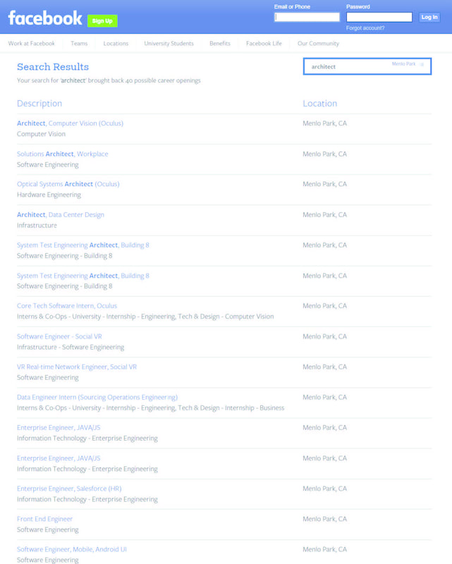 When it becomes job search time for an architect, in order to get an overview of firms and potential internships, the search starts where most searches these days start, Google. That search may lead to some other websites that specialize in job or internship postings, but something interesting continues to happen when using the keyword ‘architect’. Intermixed with a few listings that meet the generally expected criteria are companies like IBM, Google, and others specializing within the technology sector. Facebook lists ‘Optical Systems Architect’ and ‘Solutions Architect’ on their careers page, Google has an opening for a ‘Cloud Architect’, and Apple is searching for an ‘Imaging and Vision Architect’ along with 600 listed jobs that appear with the keyword ‘architect’. Although the amount of tech jobs, the search for that elusive job goes on, unknowingly witnessing a phenomenon that seems to raise profound questions about architecture and the architect in today’s world and in the future.