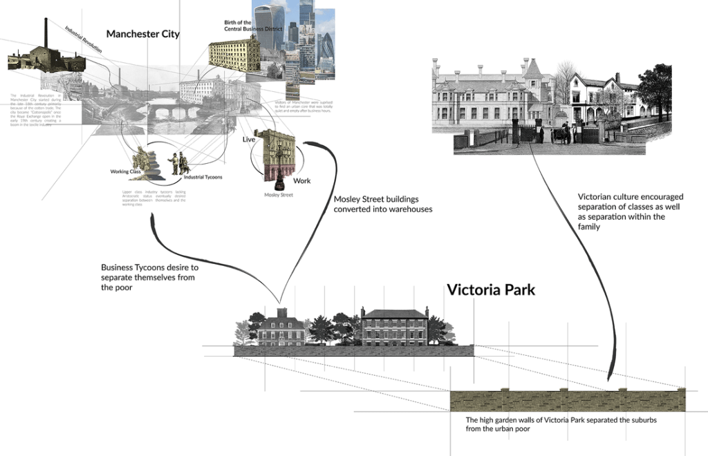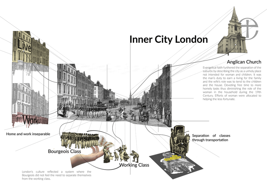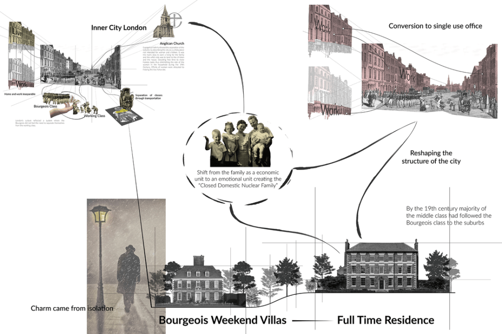The below images were completed with the intention to be used to contextualize migration patterns of early suburban developments in England and the United States. The exploded collages were created using information from Bourgeois Utopias by Robert Fisherman and Edge City: Life on the New Frontier by Joel Garreau. Unifortuanity these diagrams have been shelved in the Digital Mortuary of Studio Ambiguous with the hopes of being influential later in the thesis process.