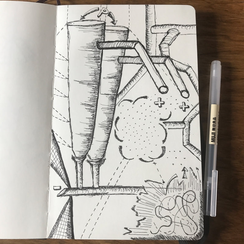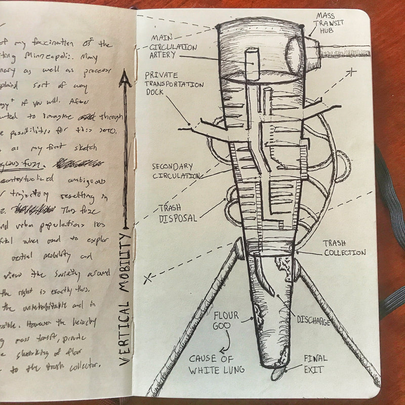 While visiting Minneapolis over the 4th of July weekend I became fascinated with the milling industry and how it shaped the city. The success of the city directly coordinates with the milling industry’s success and eventual failure within the city. The fascination with the milling industry followed me back to Omaha as I spent a week researching and sketching through my thoughts. The tiers that were evident within the milling industry and the process of the milling itself were extremely complex yet felt almost barbaric. The sketches below explain the importance of hydro power and ventilation in turn of the century mills. The sketches became a vehicle for exploration into a satire drawing that addresses the failures of modernist planning and design as well as vertical mobility and social hierarchy. It takes place within the the ventilation tubes drawn in sketch 2. Sketch 3 functions as a city with each tier having a specific purpose. The further down into the tube, near the discharge station, the tasks become more manual and grueling. The floor plates are tighter and shrink as spaces become more condense. The bottom tiers are left to handle the higher tiers discharge (Flour) as it flows through the disposal tubes causing a higher risk of disease (white lung). The higher tiered class has access to private transportation docks even though they are closer the the mass transit hub. The lower tears do not share in the luxuries and have to travel vertically toward the mass transit hub. A tasks that should not be taken lightly as the path is filled with segmented floors and partial ladder connections.